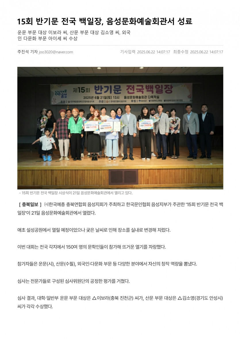 15회 반기문 전국 백일장, 음성문화예술회관서 성료(25.06.22 충북일보)