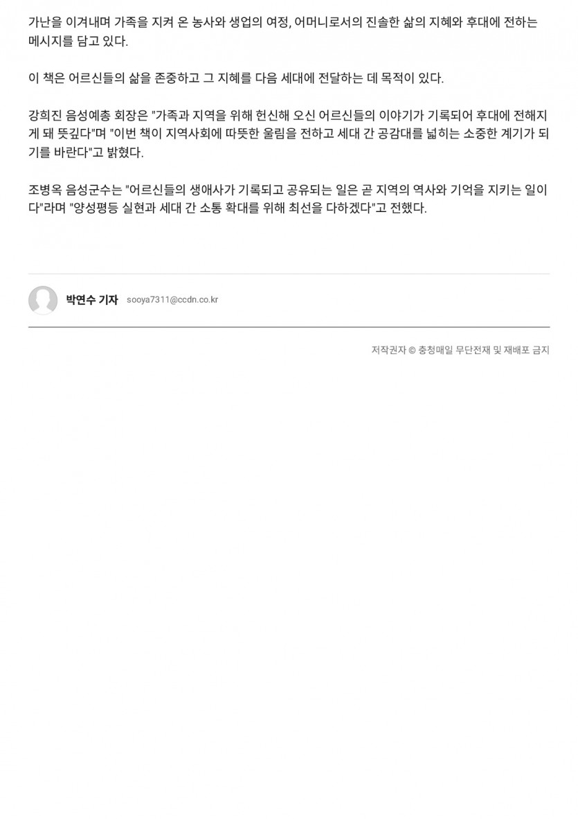 “가족 지킨 어머니의 삶, 책으로 영원히”... 음성 여성 어르신 자서전 출간(25.12.02 충청매일)