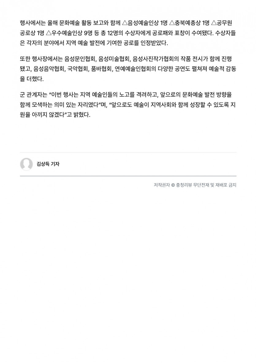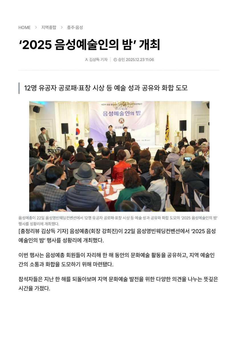 ‘2025 음성예술인의 밤’ 개최(25.12.23 충청리뷰) 작성자 : 음성예총 | 작성일 : 26-01-05 15:00 | 조회 : 14회 본문 출처 : https://www.ccreview.co.kr/news/articleView.html?idxno=340469 이전글‘2025 음성예술인의 밤’ 개최...예술 성과 공유와 화합 도모(25.12.23 음성뉴스) 26.01.05 다음글“황혼에 빛나는 선물” … 음성군 여성 어르신 자서전 출간 기념행사(25.12.02 음성타임즈) 25.12.03 목록