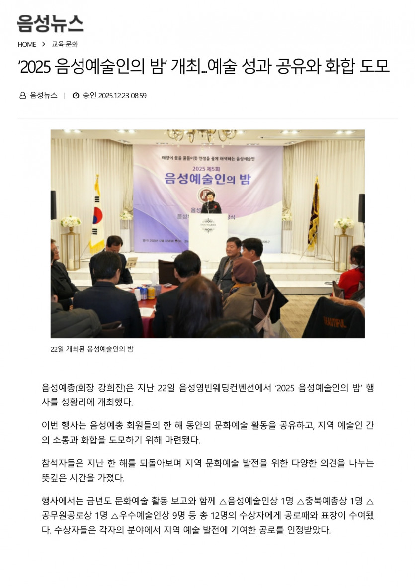 - 다음글‘2025 음성예술인의 밤’ 개최(25.12.23 충청리뷰) 26.01.05