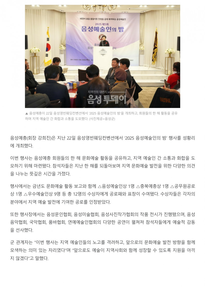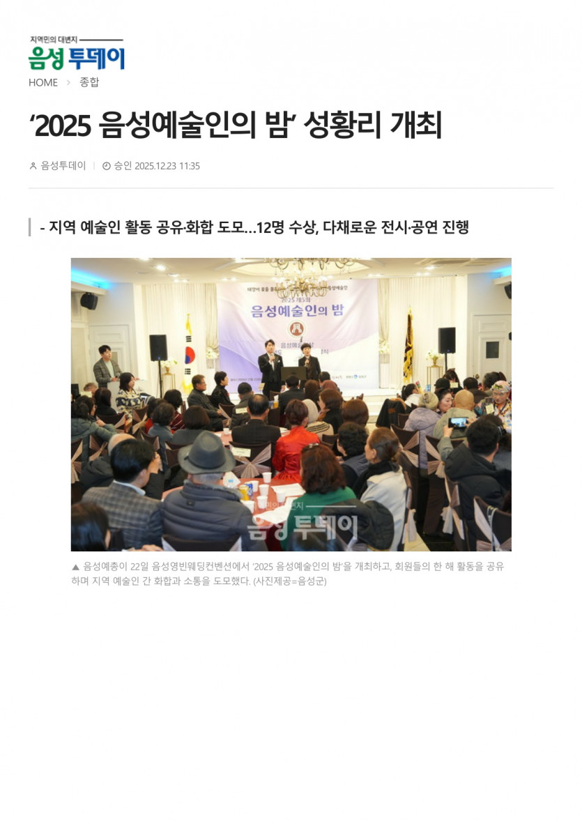 ‘2025 음성예술인의 밤’ 성황리 개최(25.12.23 음성투데이) 작성자 : 음성예총 | 작성일 : 26-01-05 15:00 | 조회 : 11회 본문 출처 : https://www.estoday.co.kr/news/articleView.html?idxno=411778 이전글“예술로 인생을 채색하다”…음성예총, ‘음성예술인의 밤’ 성료(25.12.23 음성타임즈) 26.01.05 다음글‘2025 음성예술인의 밤’ 개최...예술 성과 공유와 화합 도모(25.12.23 음성뉴스) 26.01.05 목록