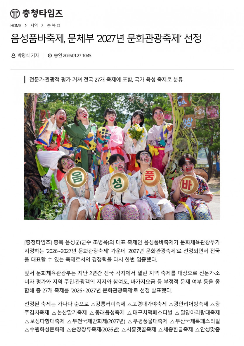- 다음글음성품바축제 '2027년 문화관광축제' 선정(26.01.27 충남일보) 26.01.27