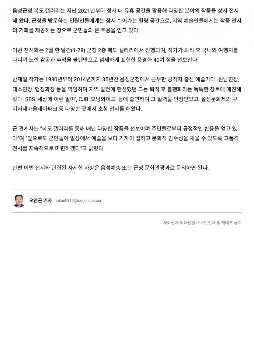 - 다음글음성군청 복도갤러리, 반재일 볼펜화 작가 개인전 열어(26.02.03 충청일보) 26.02.19