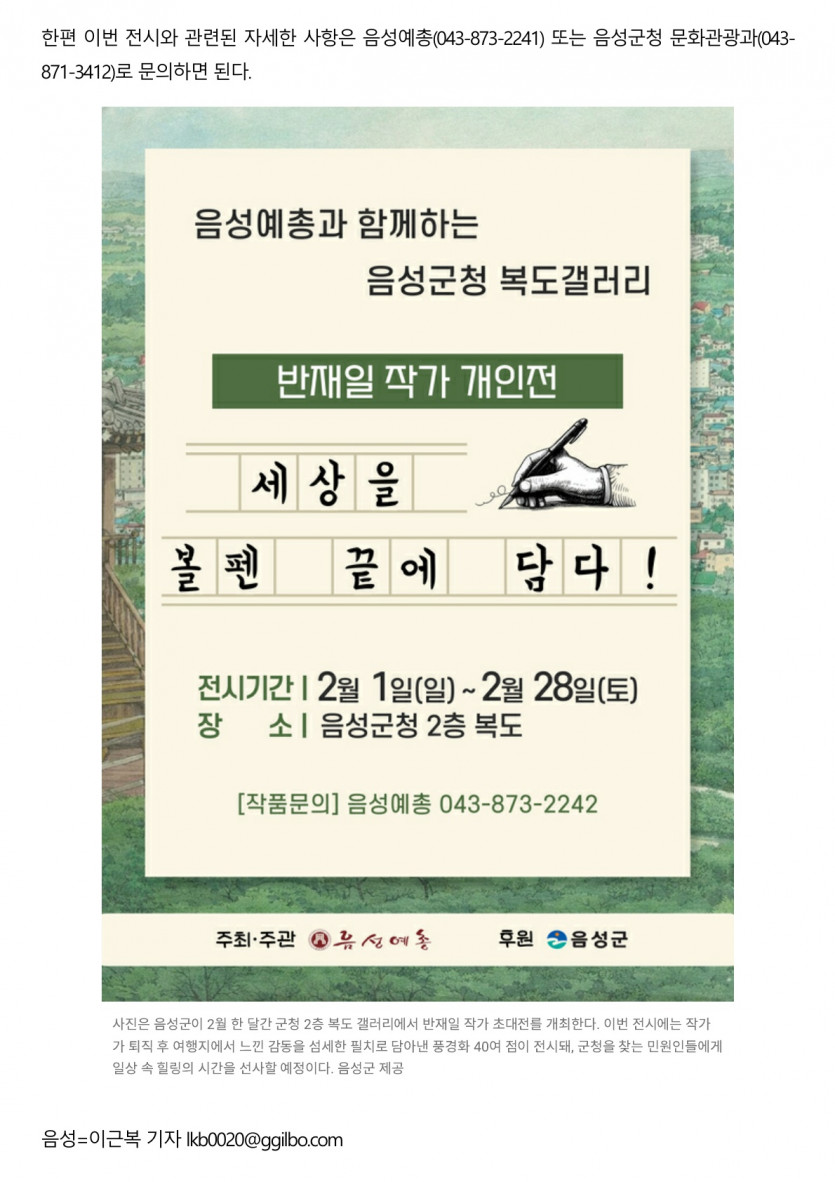 ‘세상을 볼펜 끝에 담다’ ··· 음성군청 복도 갤러리, 반재일 볼펜화 작가 개인전 개최(26.02.03 금강일보)(2) 작성자 : 음성예총 | 작성일 : 26-02-19 14:14 | 조회 : 59회 본문 출처 : https://www.ggilbo.com/news/articleView.html?idxno=1139764 이전글음성군, 청사 복도 갤러리 반재일 볼펜화 작가 개인전 개최(26.02.03 브레이크뉴스)(1) 26.02.19 다음글‘세상을 볼펜 끝에 담다’ ··· 음성군청 복도 갤러리, 반재일 볼펜화 작가 개인전 개최(26.02.03 금강일보)(1) 26.02.19 목록