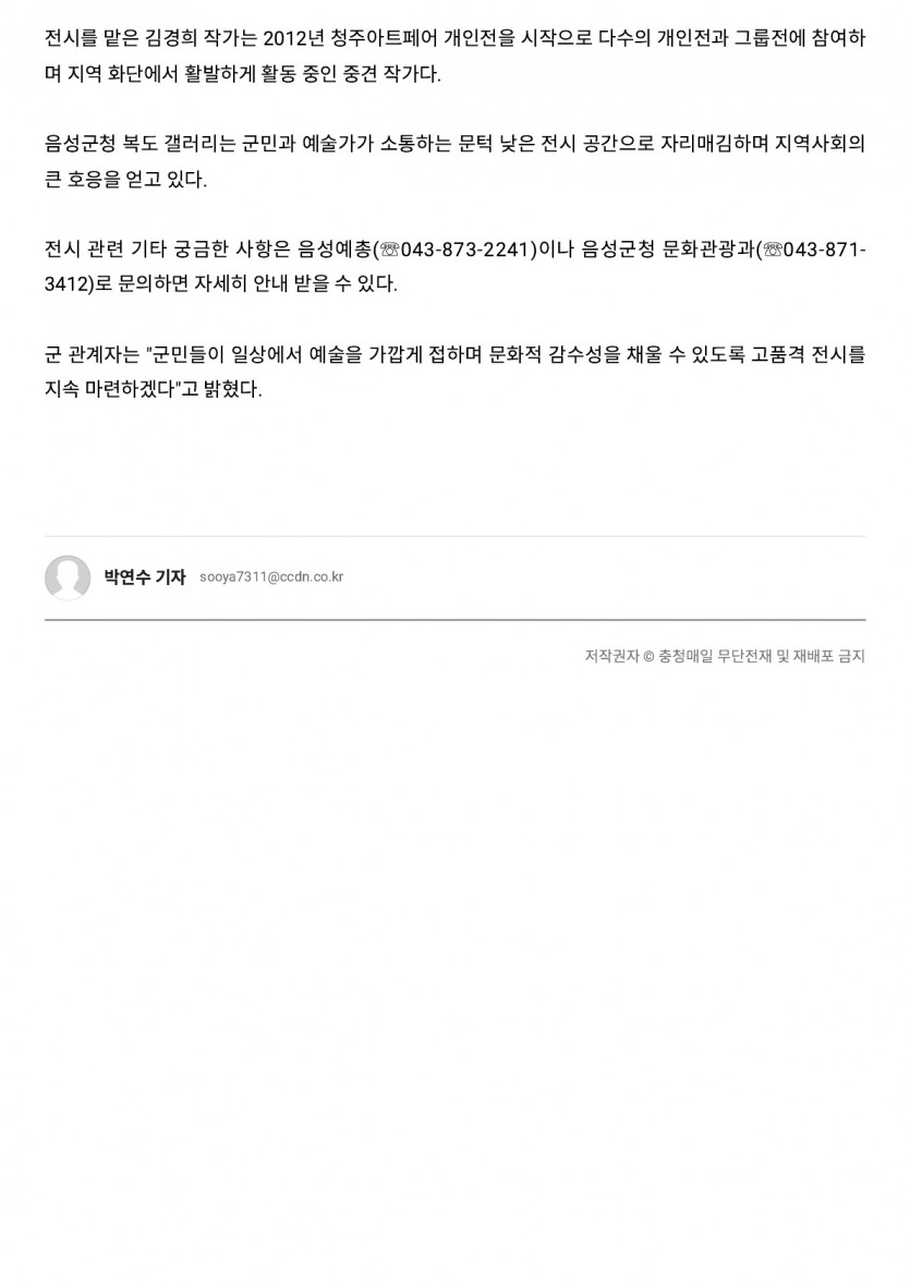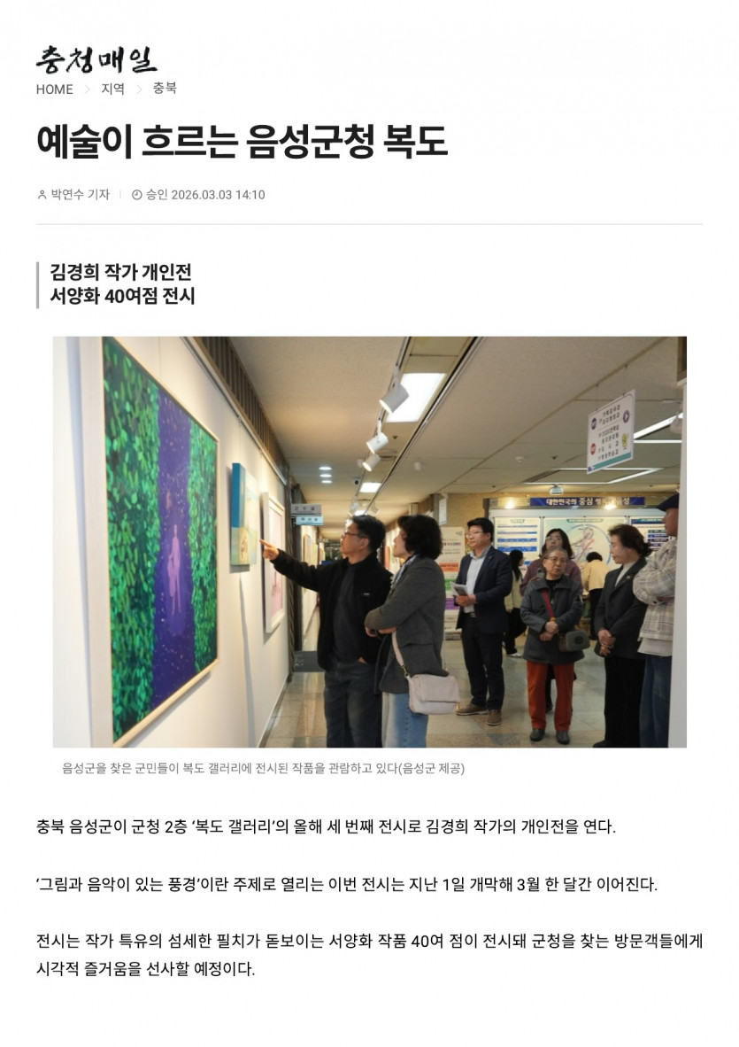 - 이전글음성군, 3월 복도 갤러리 '김경희 작가 개인전' 개최(26.03.03 충북일보) 26.03.04