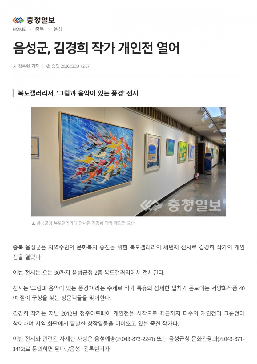 음성군, 김경희 작가 개인전 열어(26.03.03 충청일보)