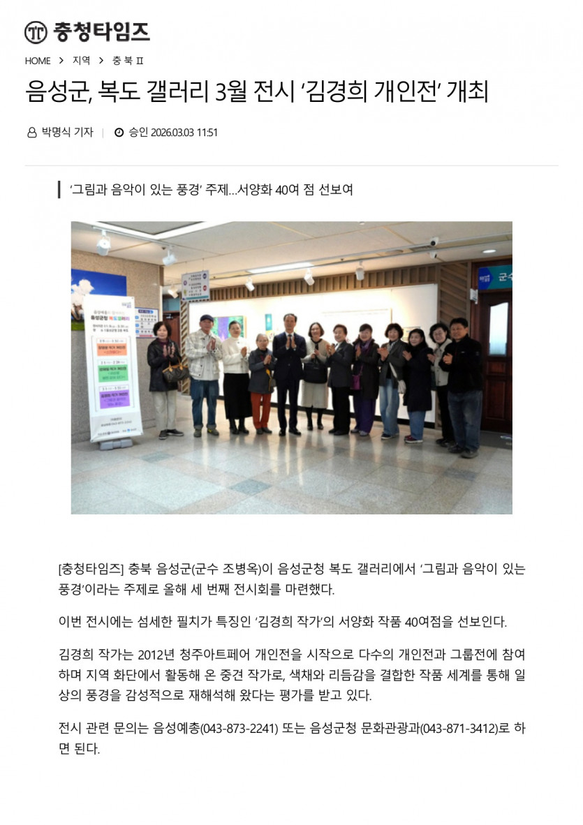 음성군, 복도 갤러리 3월 전시 ‘김경희 개인전’ 개최(26.03.03 충청타임즈)