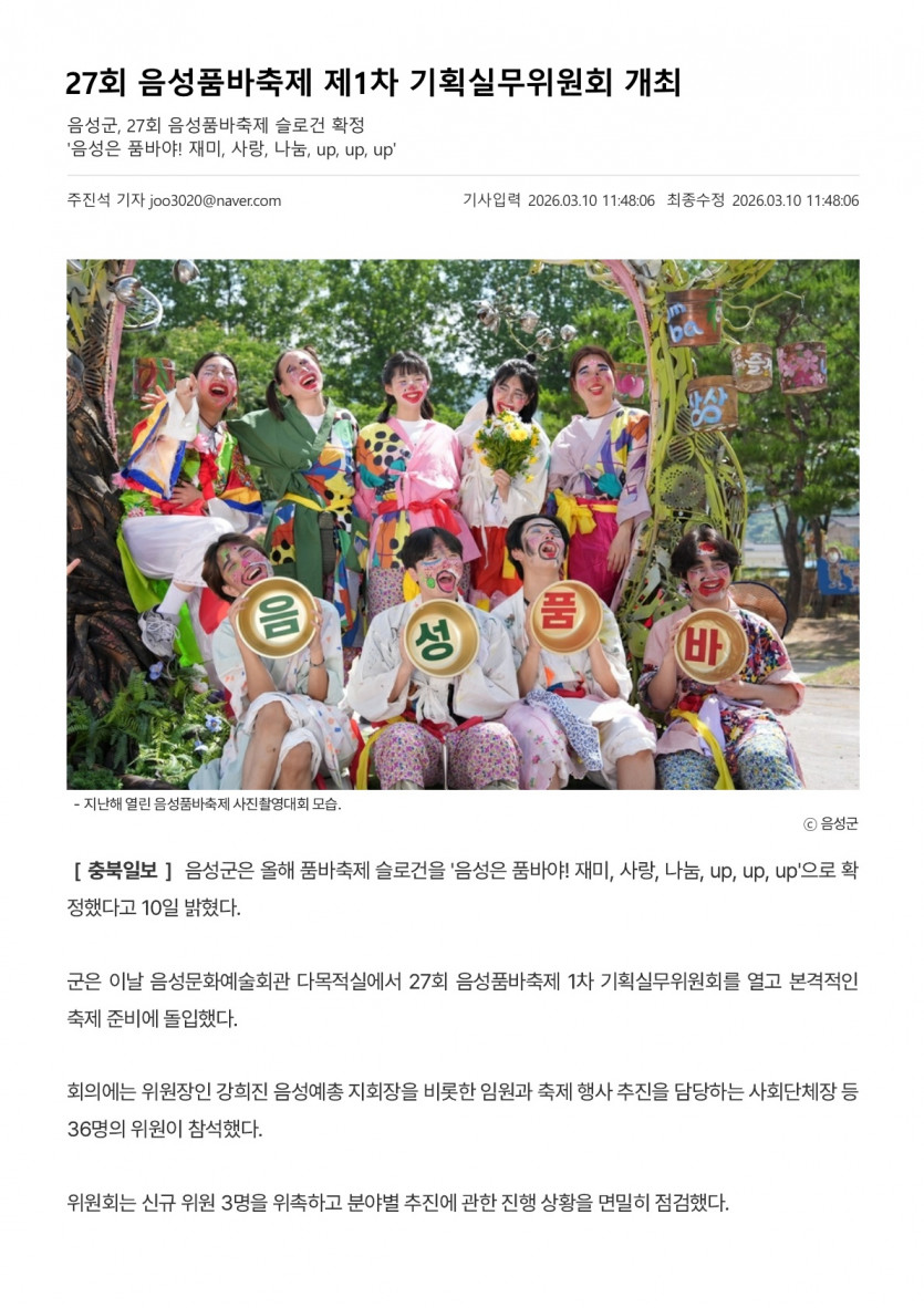 - 다음글제27회 음성품바축제 제1차 기획실무위원회 개최(26.03.10 금강일보) 26.03.12