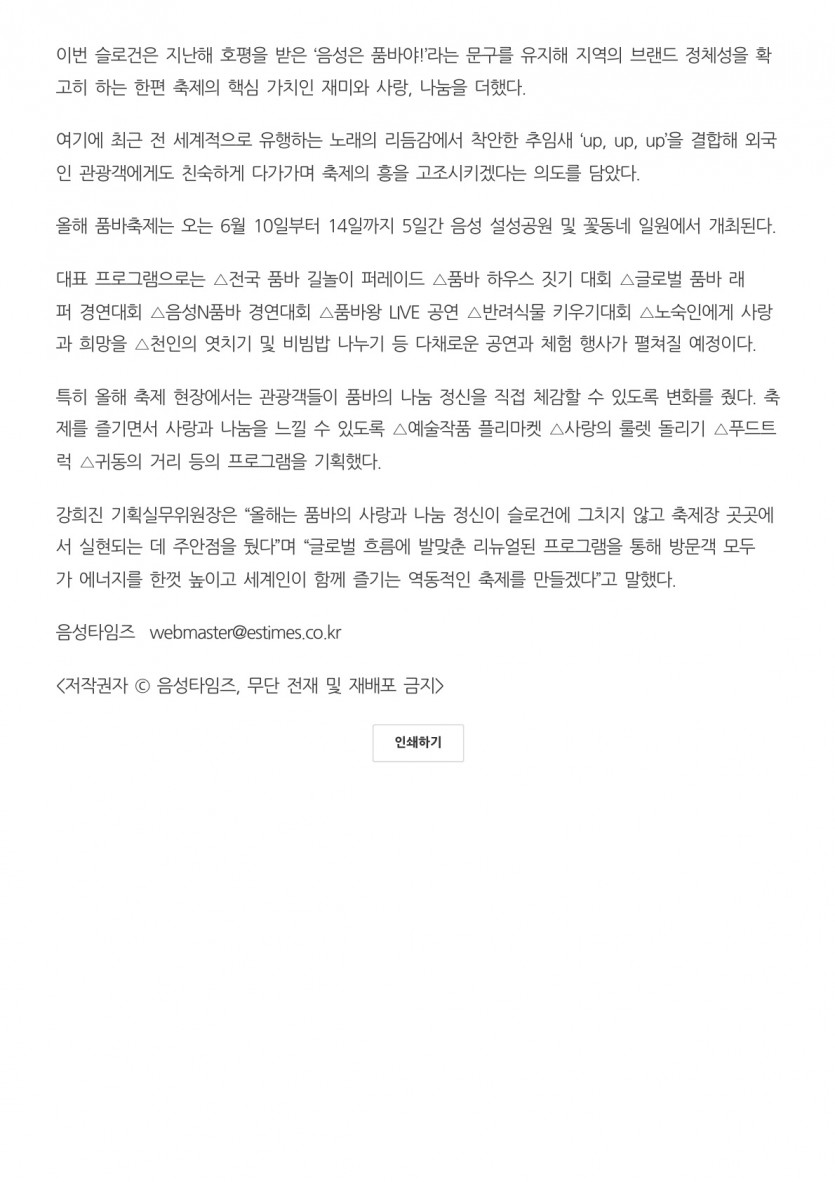 - 다음글음성군, 제27회 음성품바축제 1차 기획실무위원회 열어(26.03.10 충청일보) 26.03.12