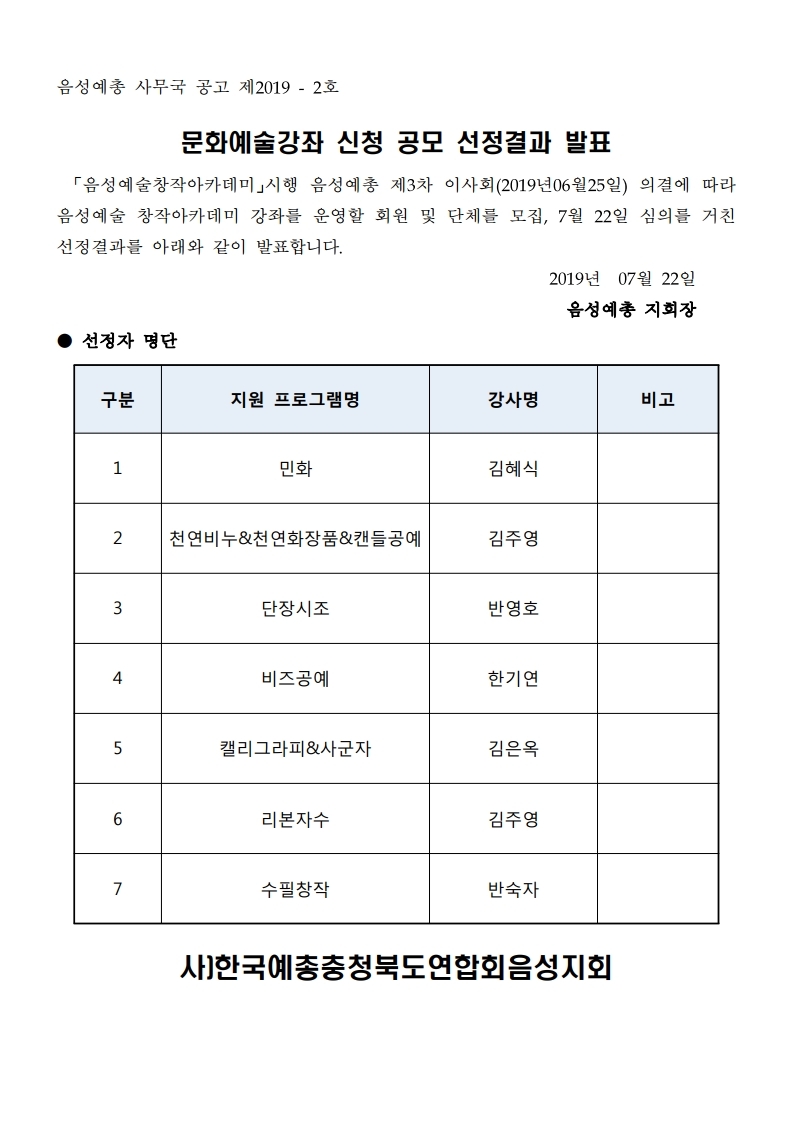 - 다음글2019 음성예술창작아카데미 강좌 신청 공고 25.09.18