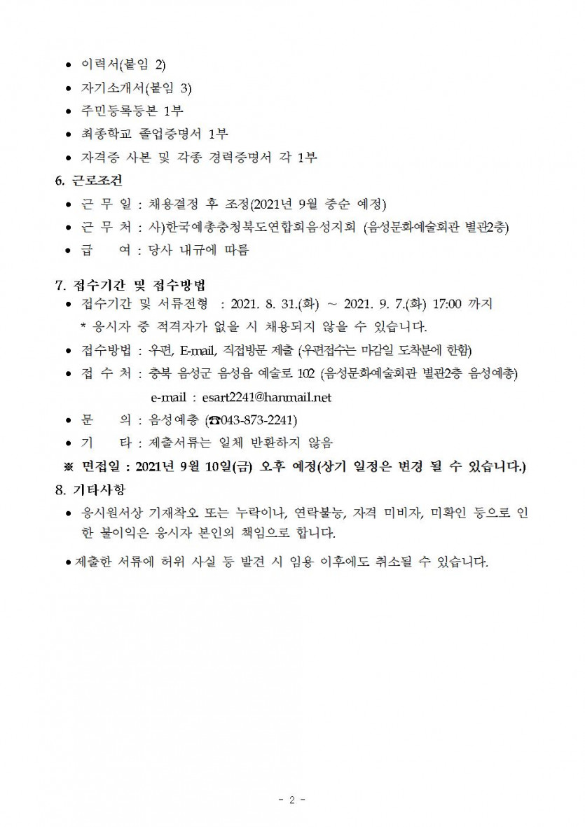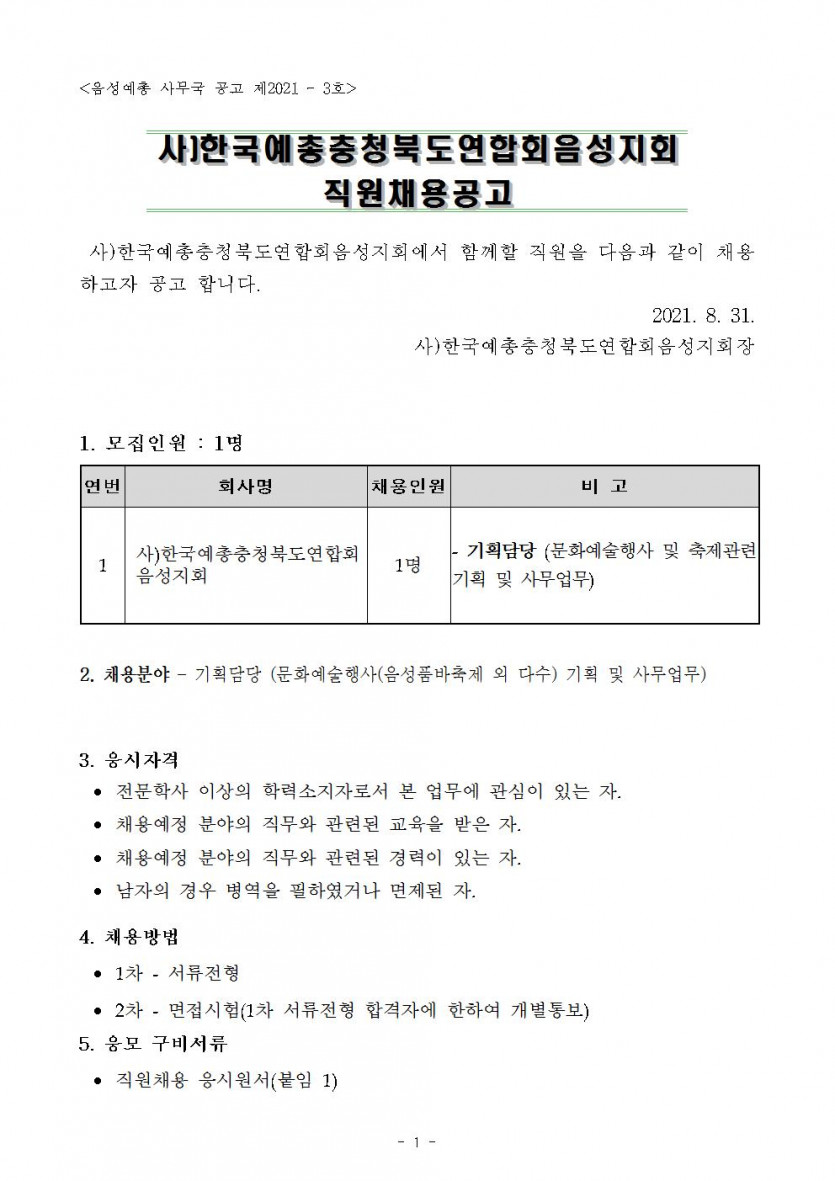 2021 한국예총 음성지회 사무국 직원 채용 공고
