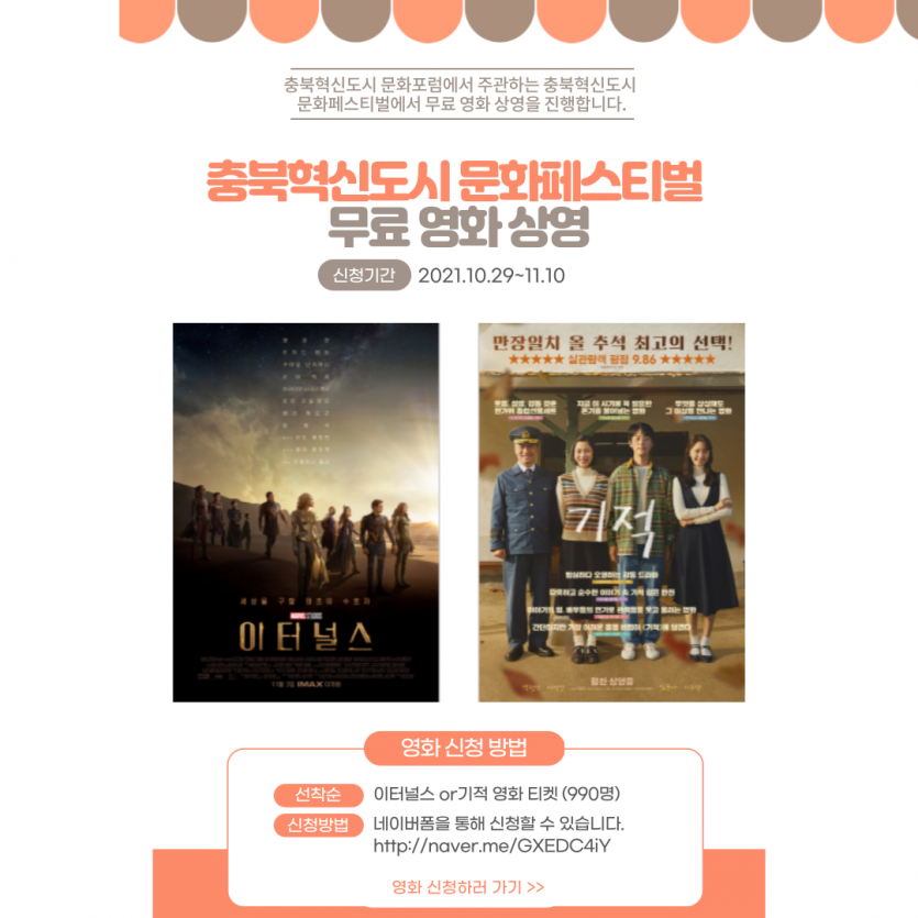 충북혁신도시 문화포럼에서 주관하는 충북혁신도시 문화페스티벌에서 무료 영화 상영을 진행합니다.
