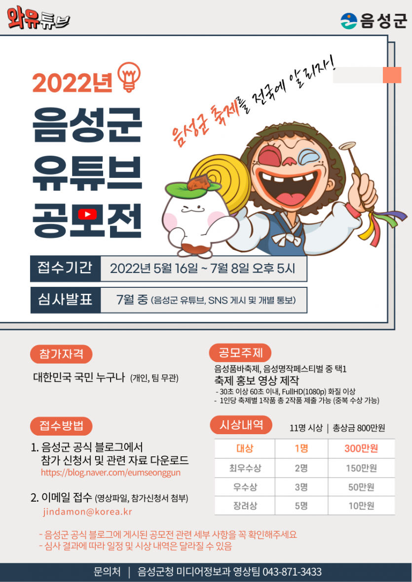 공모주제는 음성품바축제, 음성명작페스티벌 중 한개를 택하여 축제 홍보영상(30초 이상 60초 이내)을 제작하는 공모전 입니다.