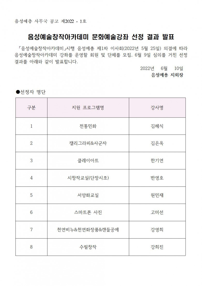 2022 음성예술창작아카데미 문화예술강좌 선정 결과