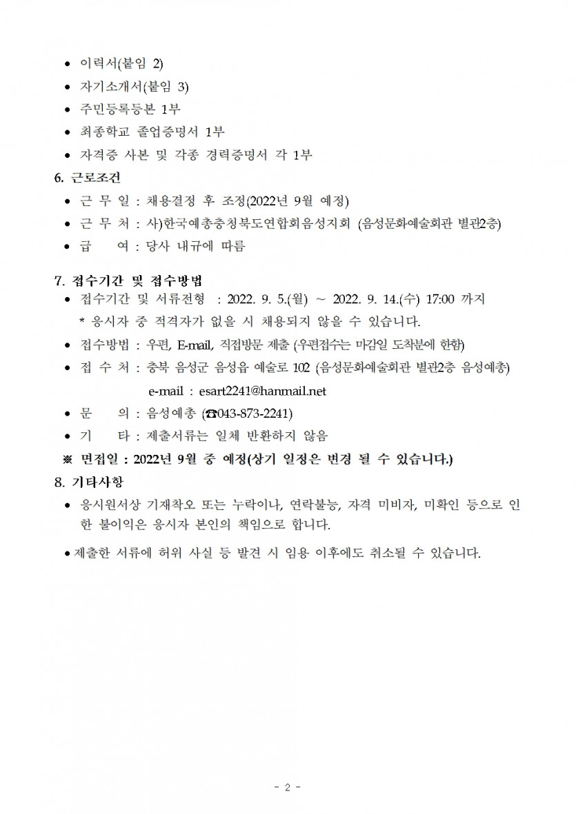 2022 한국예총 음성지회 사무국 직원 채용 공고