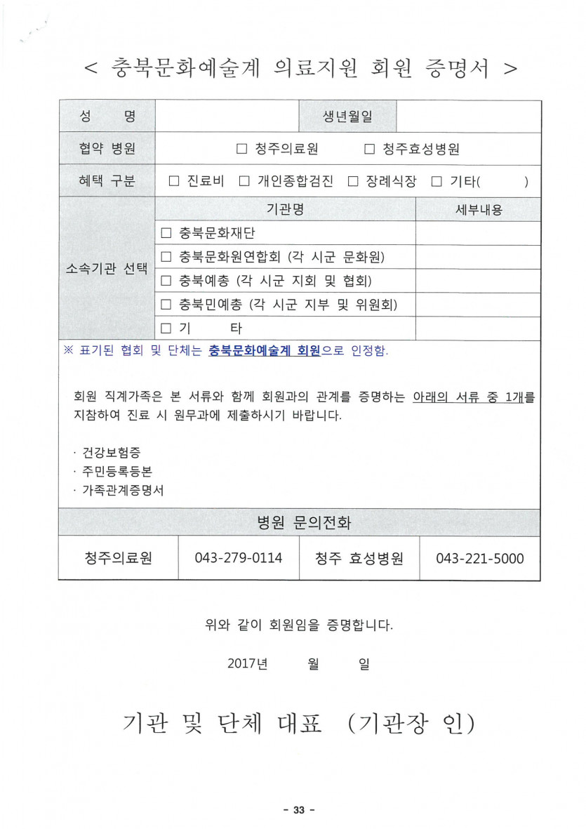충북문화예술계 예술인 복지를 위한 의료지원 안내