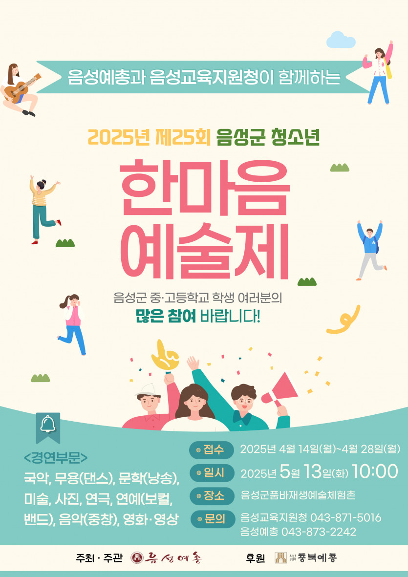 - 내용: 음성군 청소년 경연대회(국악, 무용, 문학, 미술, 사진, 연극, 연예, 음악, 영화영상)