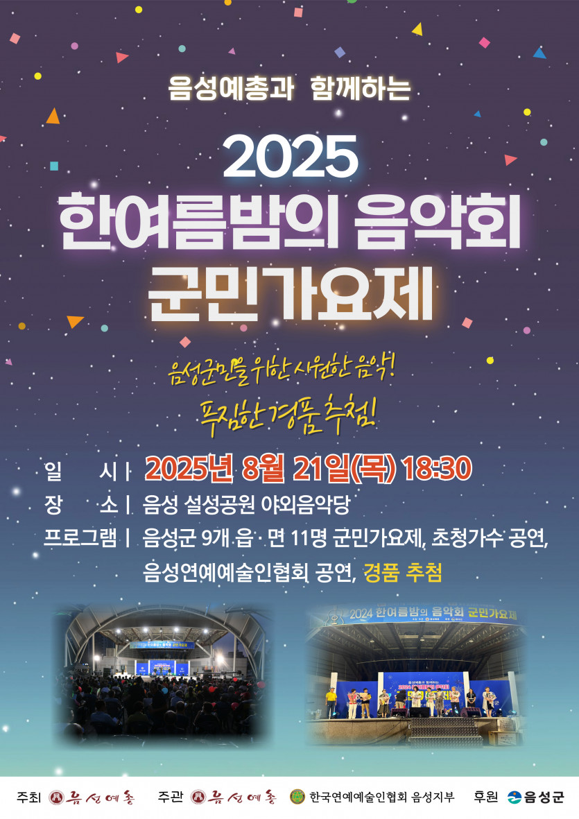 - 내용: 음성군 9개 읍·면 11명 군민가요제, 초청가수 공연, 음성연예예술인협회 공연, 경품 추첨