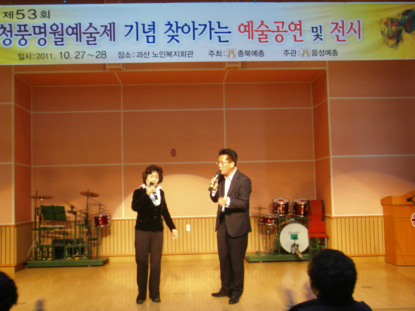 지난 10월20일~21일 10월27일~28일까지 찾아가는예술공연 및 전시를 진천군 노인복지회관과 괴산군노인복지회관을 방문하여 음성예총 회원여러분들의 작품전시 및 공연을 하였다.