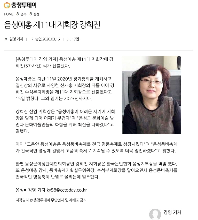 - 다음글음성예총 제11대 지회장 강희진 - 지역문화예술인들과 화합 최선 25.09.18