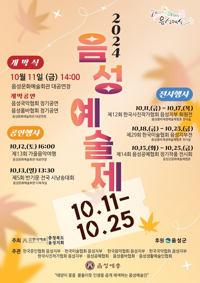 개막행사는 11일 오후 2시 문화예술회관 대공연장에서 음성국악협회와 음성품바협회 정기공연으로 시작되고, 12일 오후 4시 음악협회 주관으로 13회 가을음악여행 공연이 문화예술회관 대공연장에서 열린다.