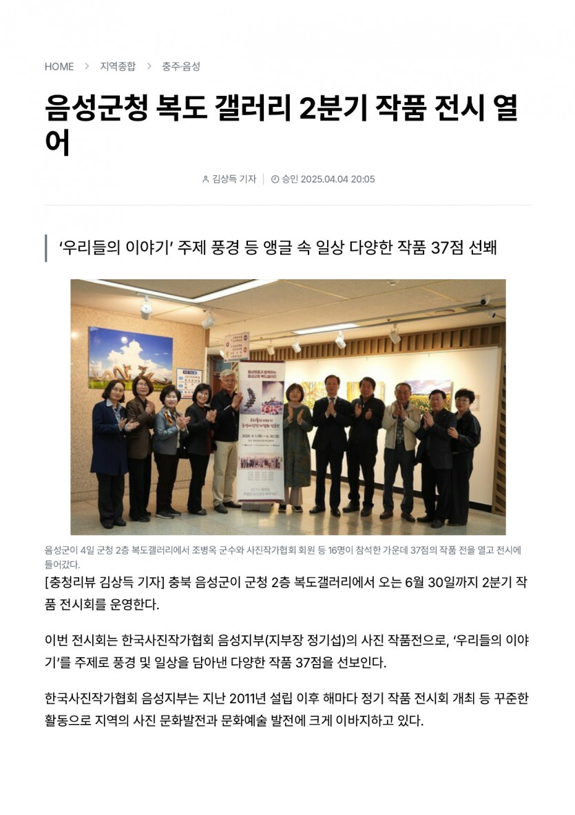 음성군청 복도 갤러리 2분기 작품 전시 열어(25. 4. 4. 충청리뷰)