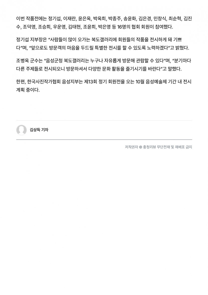 - 이전글음성군청 복도 갤러리 2분기 작품 전시 개최(25. 4. 4. 이뉴스투데이) 25.09.18
