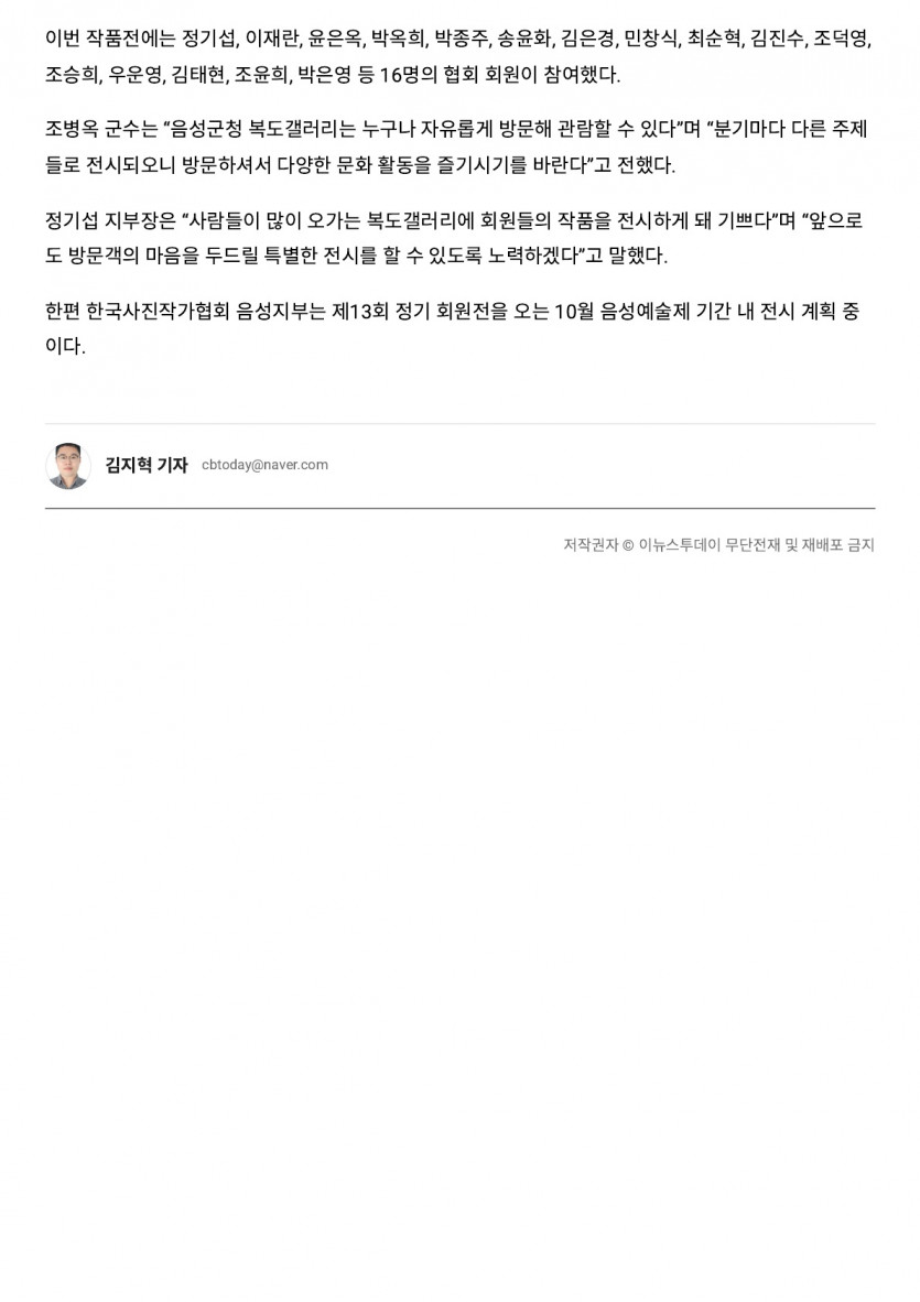 - 이전글음성군, 복도갤러리 2분기 작품 전시회 개최(25. 4. 4. 중도일보) 25.09.18