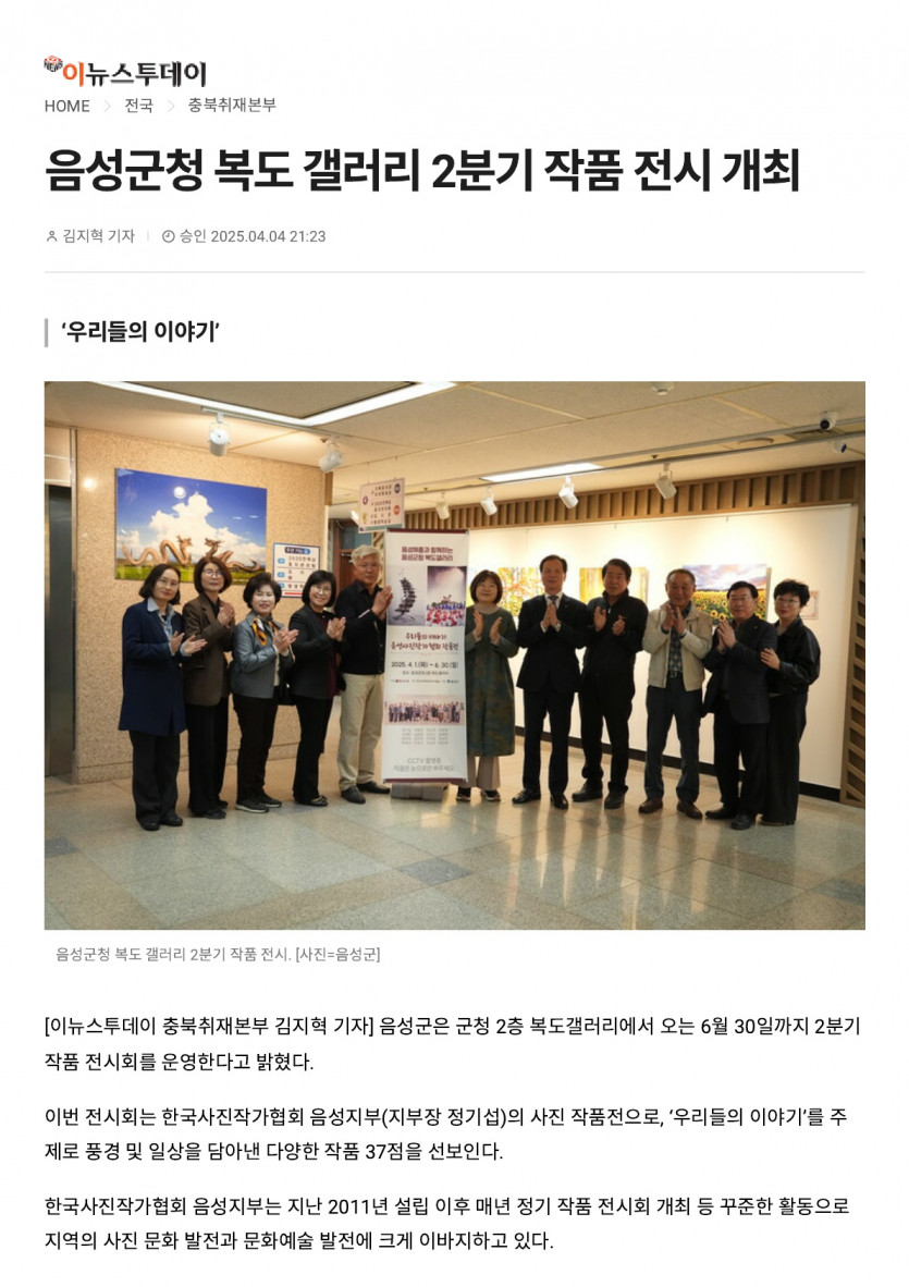 음성군청 복도 갤러리 2분기 작품 전시 개최(25. 4. 4. 이뉴스투데이)