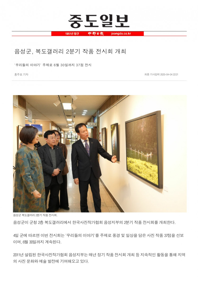 음성군, 복도갤러리 2분기 작품 전시회 개최(25. 4. 4. 중도일보)