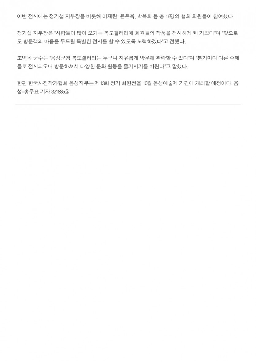 - 이전글음성군, 군청 복도갤러리 2분기 작품 전시회…사진작가협회 회원 16명이 참여(25. 4. 6. 충북일보) 25.09.18