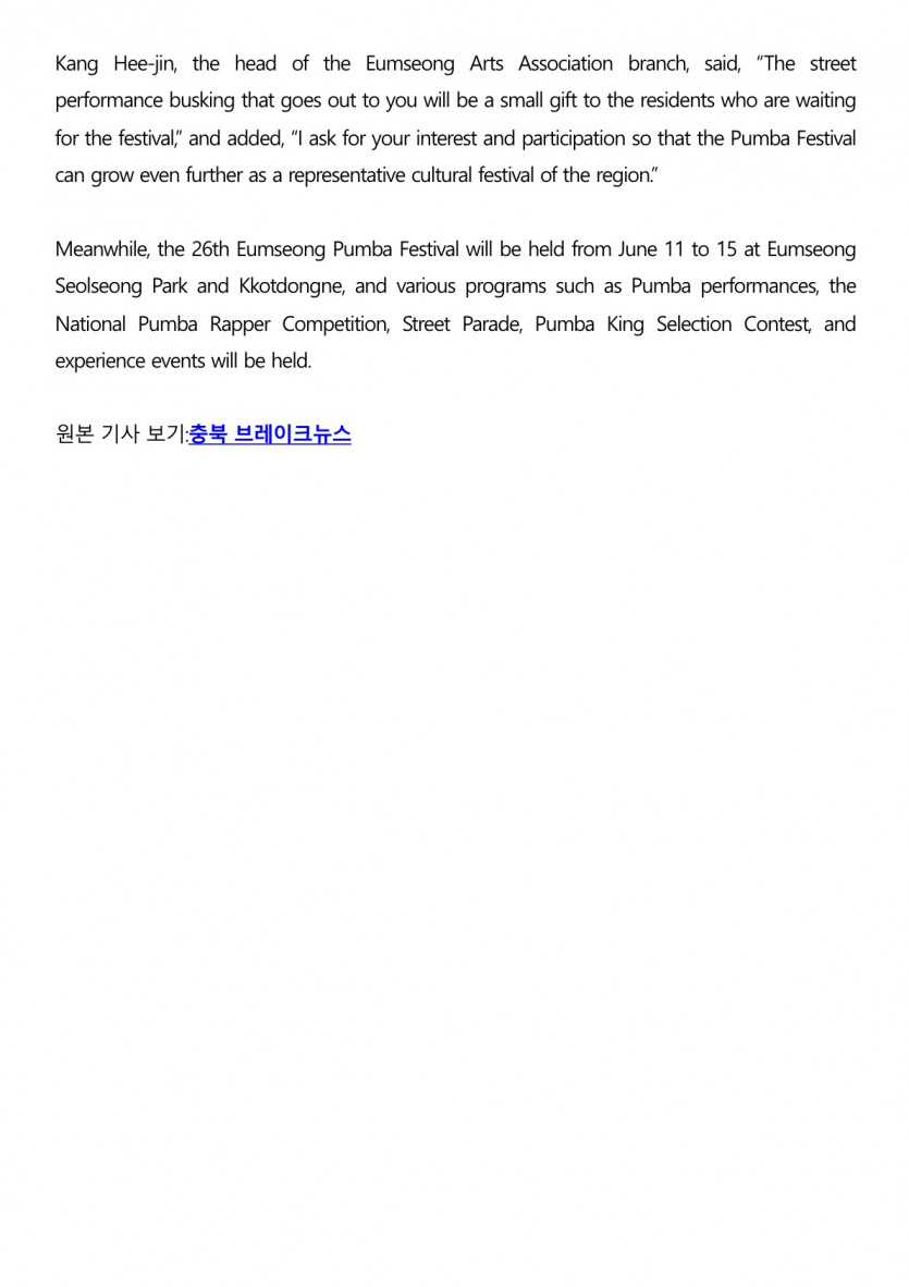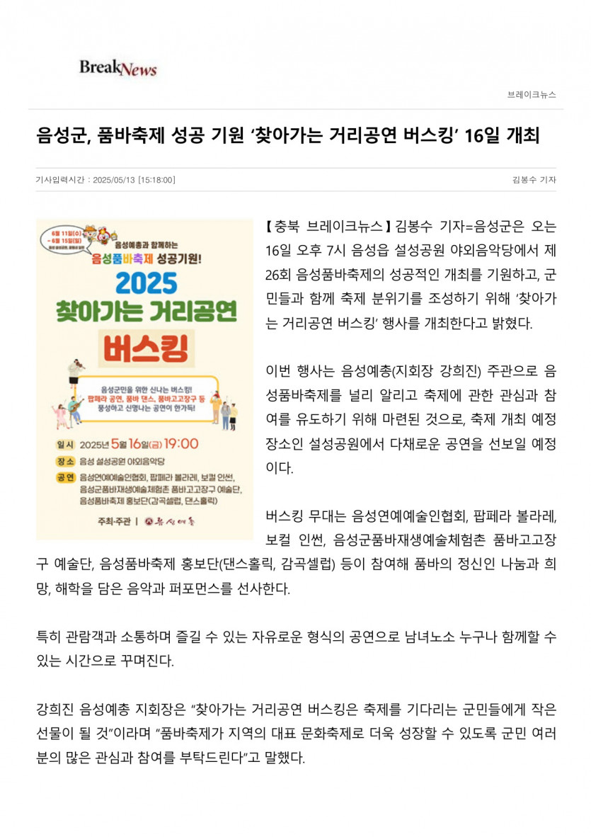 음성군, 품바축제 성공 기원 ‘찾아가는 거리공연 버스킹’ 16일 개최(25. 5. 13. 브레이크뉴스)