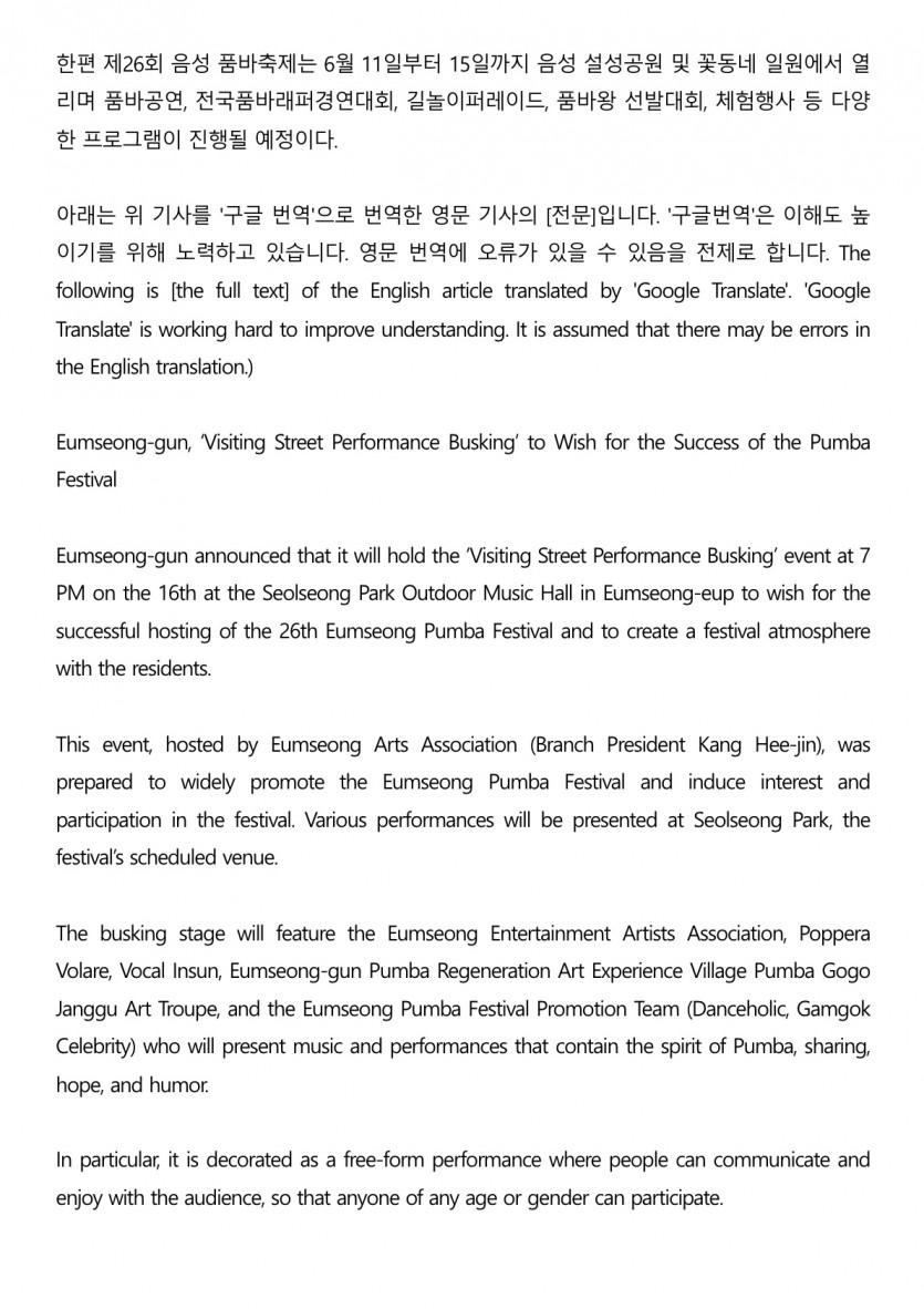 - 이전글음성품바축제 성공 기원 ‘찾아가는 거리공연 버스킹’ 개최(25. 5. 13. 충청타임즈) 25.09.18