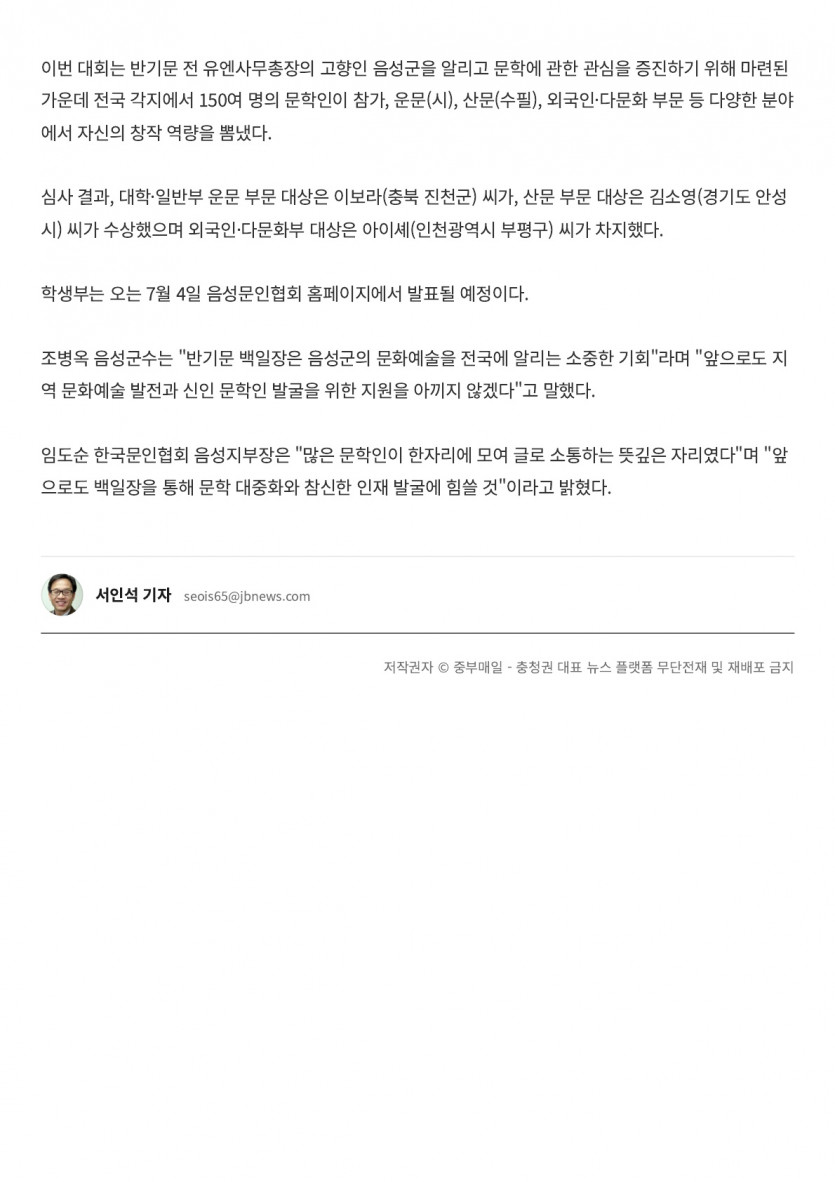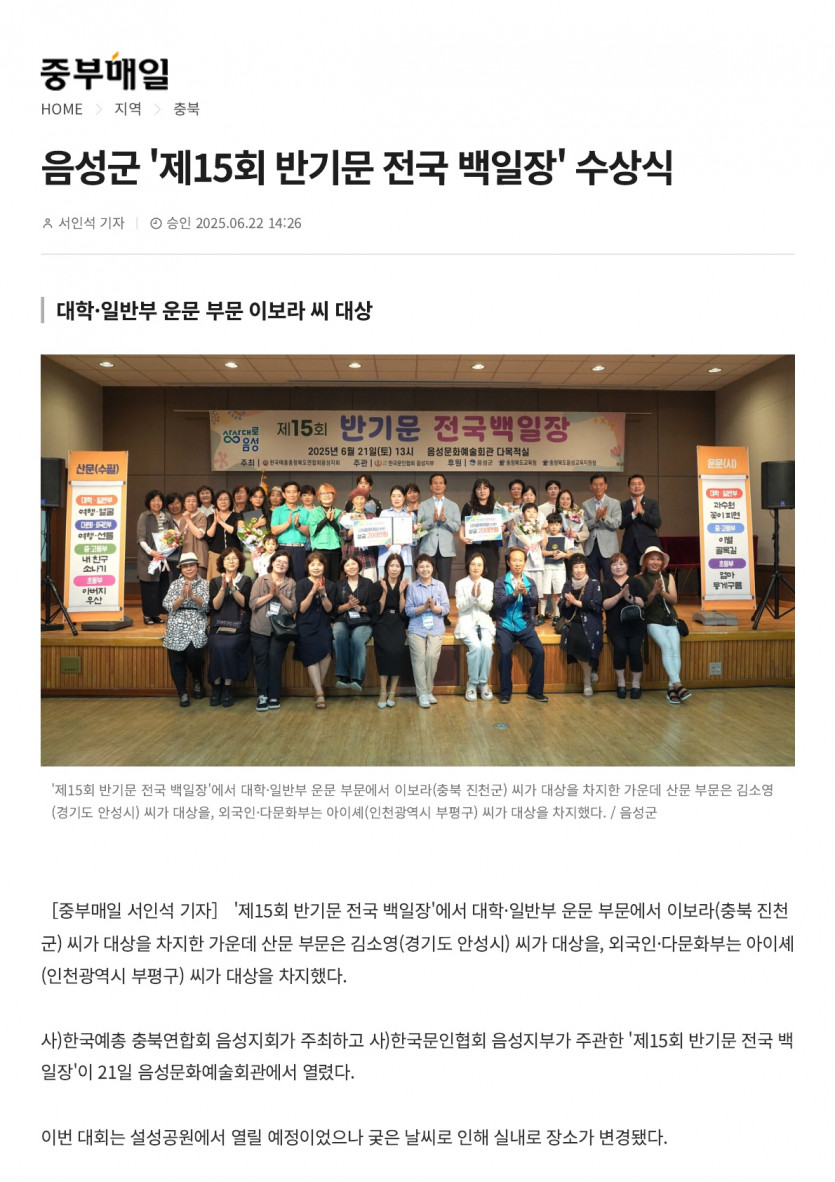 음성군 '제15회 반기문 전국 백일장' 수상식(25.06.22 중부매일)