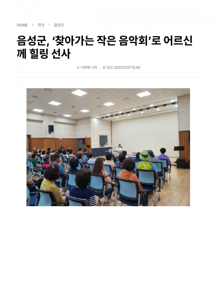음성군, ‘찾아가는 작은 음악회’로 어르신께 힐링 선사(25.07.07 불교공뉴스)