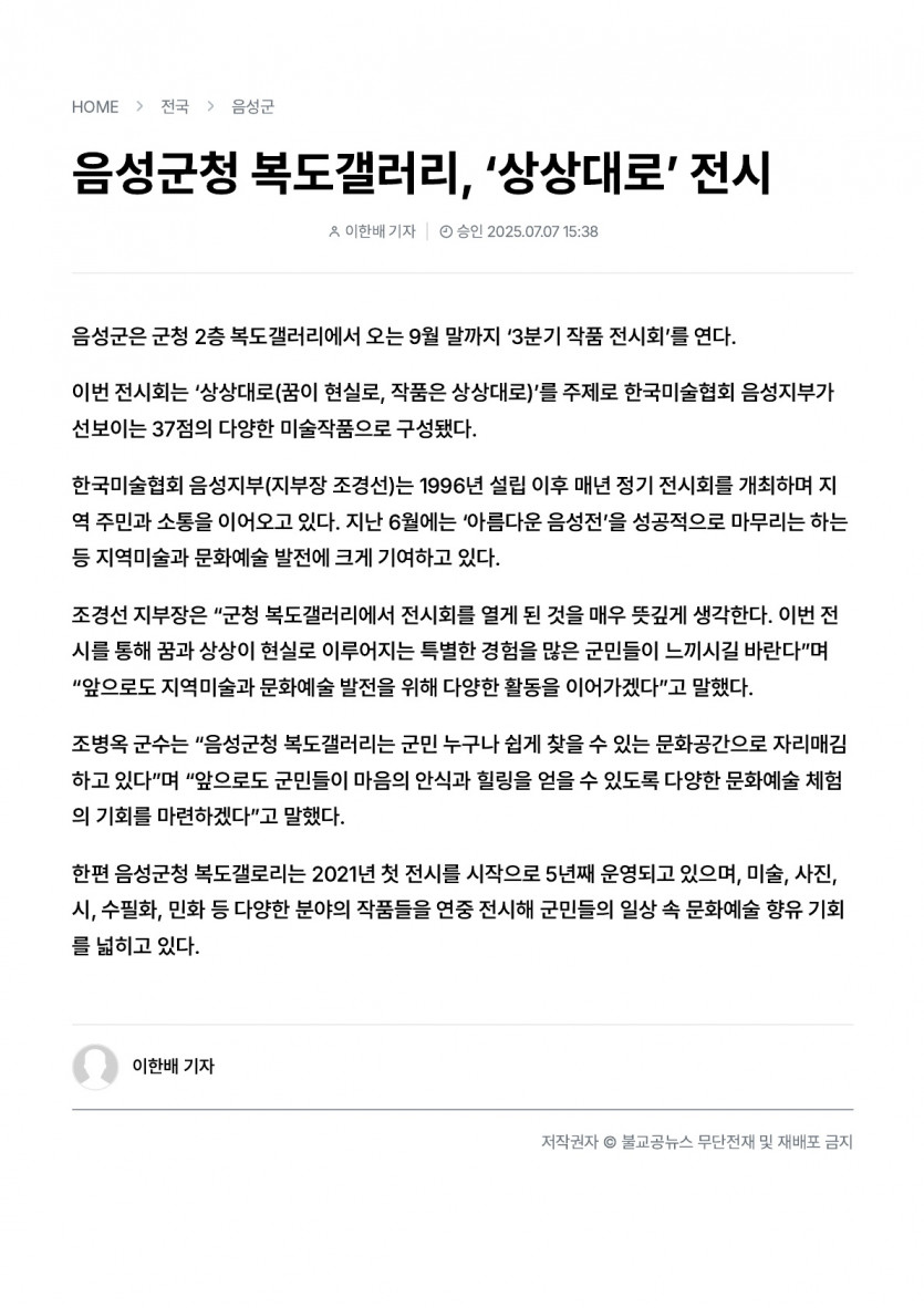 음성군청 복도갤러리, ‘상상대로’ 전시(25.07.07 불교공뉴스)
