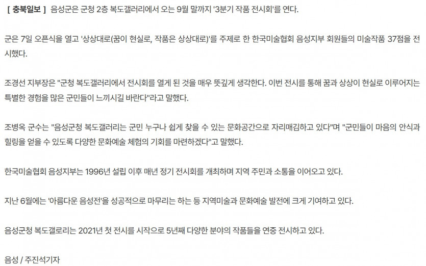 음성군청 복도갤러리, 3분기 작품 '상상대로' 전시(25.07.07 충북일보)