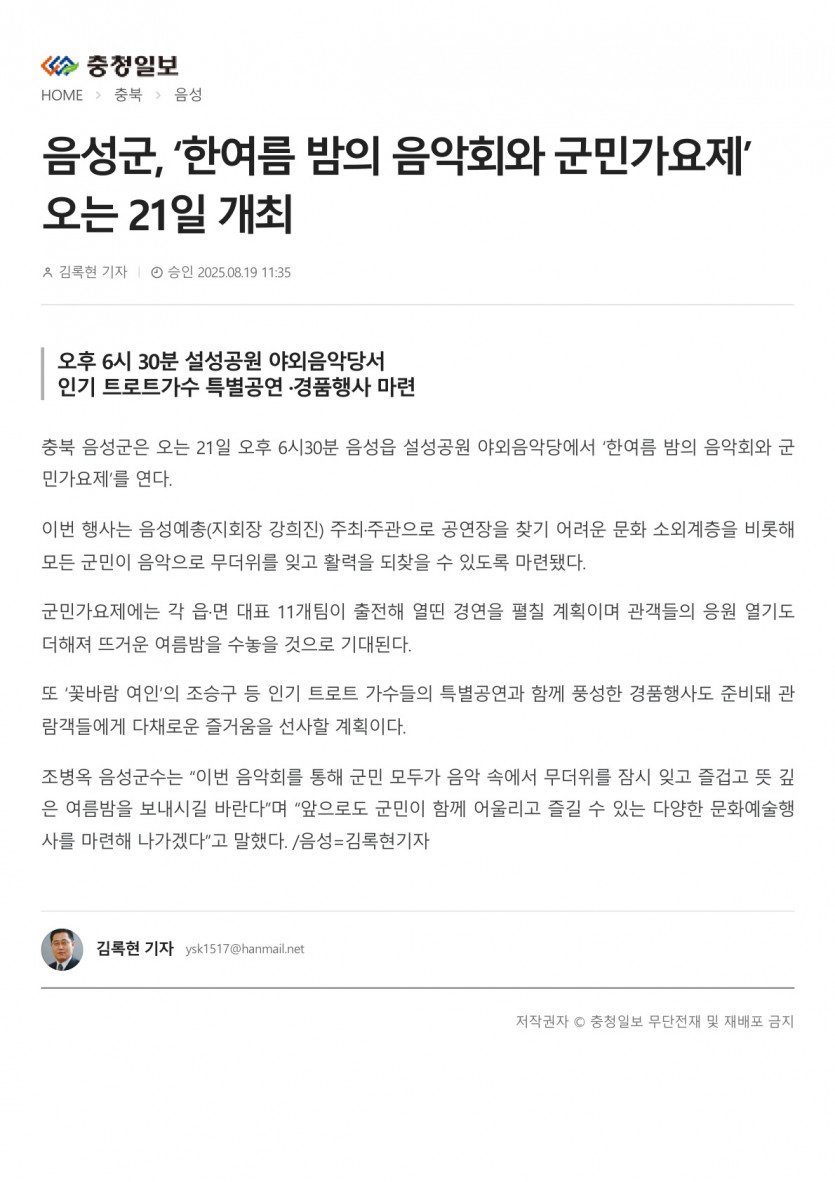 음성군, ‘한여름 밤의 음악회와 군민가요제’ 오는 21일 개최(25.08.19 충청일보)