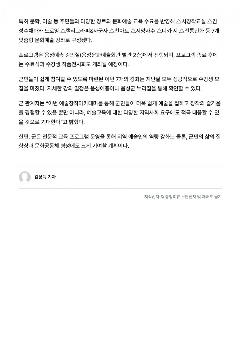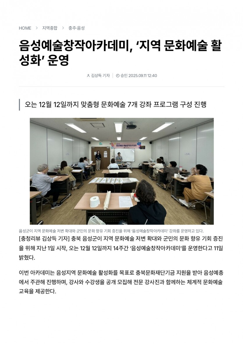 음성예술창작아카데미, ‘지역 문화예술 활성화’ 운영(25.09.11 충청리뷰)