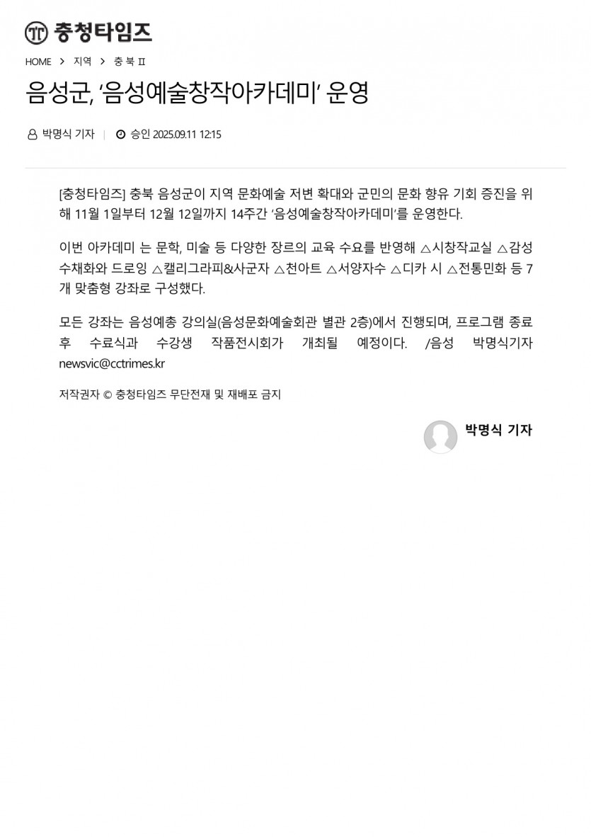 음성군, ‘음성예술창작아카데미’ 운영(25.09.11 충청타임즈)