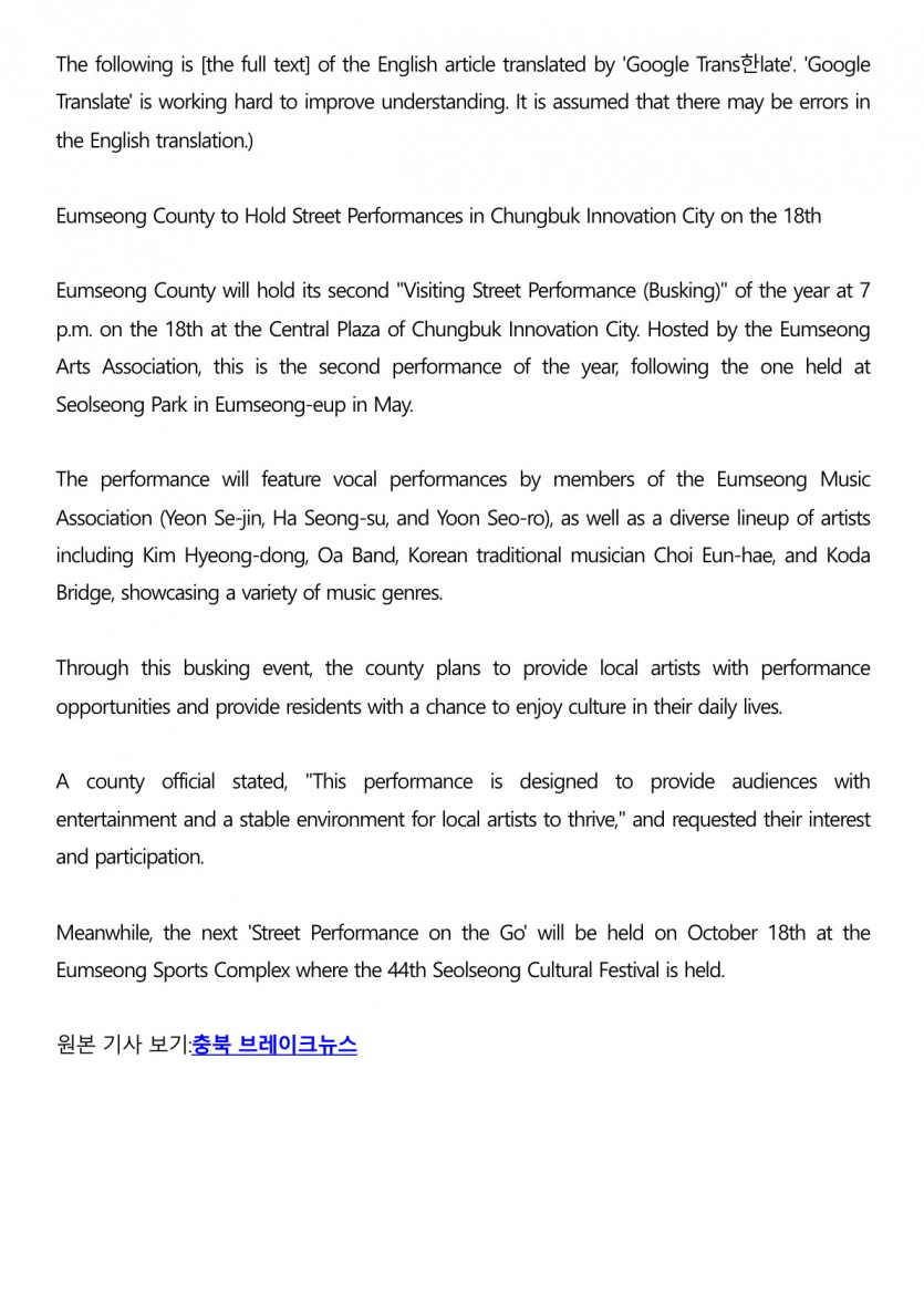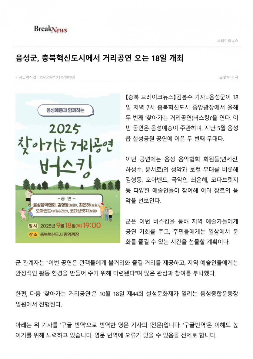 음성군, 충북혁신도시에서 거리공연 오는 18일 개최(25.09.16 브레이크뉴스)