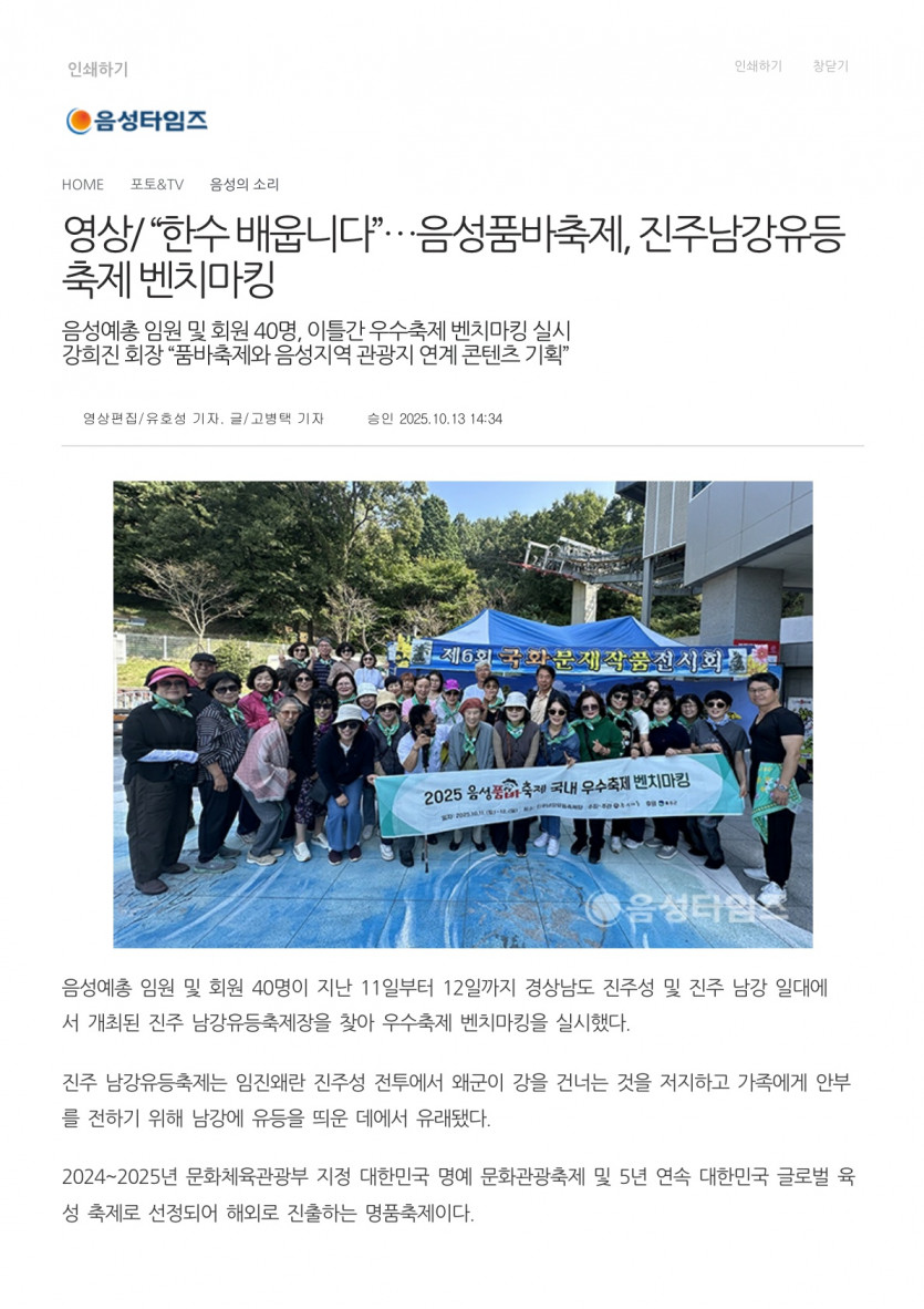 - 이전글“한수 배웁니다”…음성품바축제, 진주남강유등축제 벤치마킹(25.10.13 음성타임즈)(2) 25.10.29