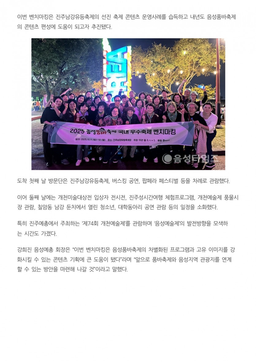 “한수 배웁니다”…음성품바축제, 진주남강유등축제 벤치마킹(25.10.13 음성타임즈)(1)
