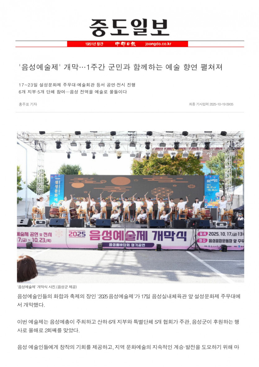 '음성예술제' 개막…1주간 군민과 함께하는 예술 향연 펼쳐져(25.10.19 중도일보)