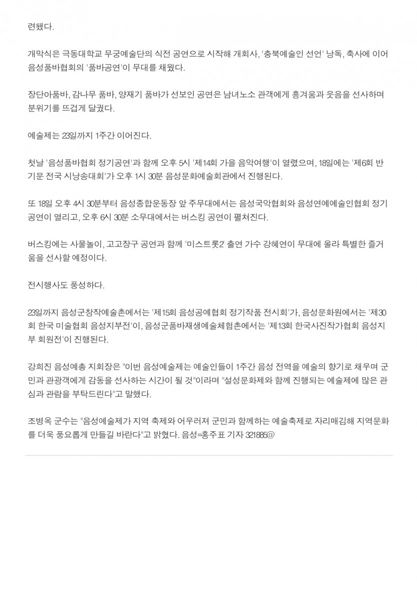 - 다음글음성예술제, 음성 전역을 예술 향기로 물들이다(25.10.18 투어코리아뉴스) 25.10.29