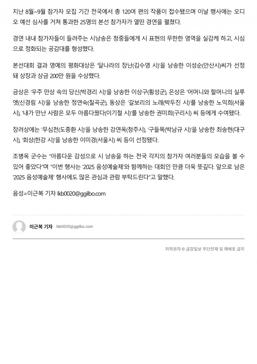 - 이전글제6회 반기문 전국 시낭송대회 개최(25.10.20 충청리뷰) 25.10.29