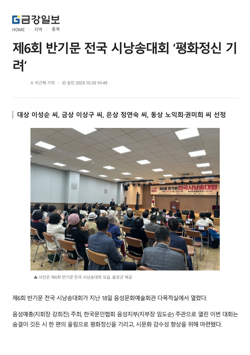 제6회 반기문 전국 시낭송대회 ‘평화정신 기려’(25.10.20 금강일보)