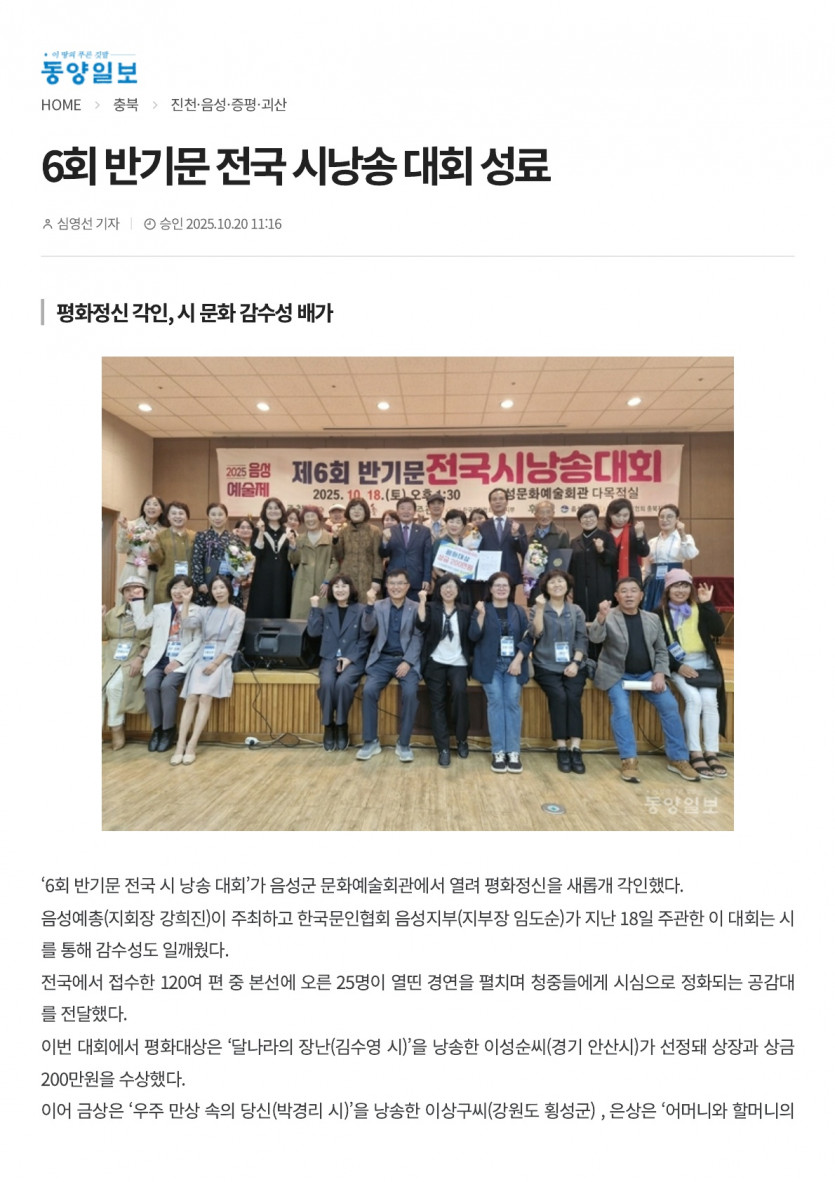 제6회 반기문 전국 시낭송 대회 성료(25.10.20 동양일보)