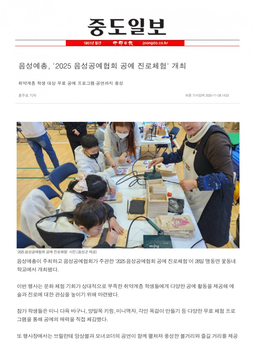 음성예총, '2025 음성공예협회 공예 진로체험' 개최(25.11.21 중도일보)