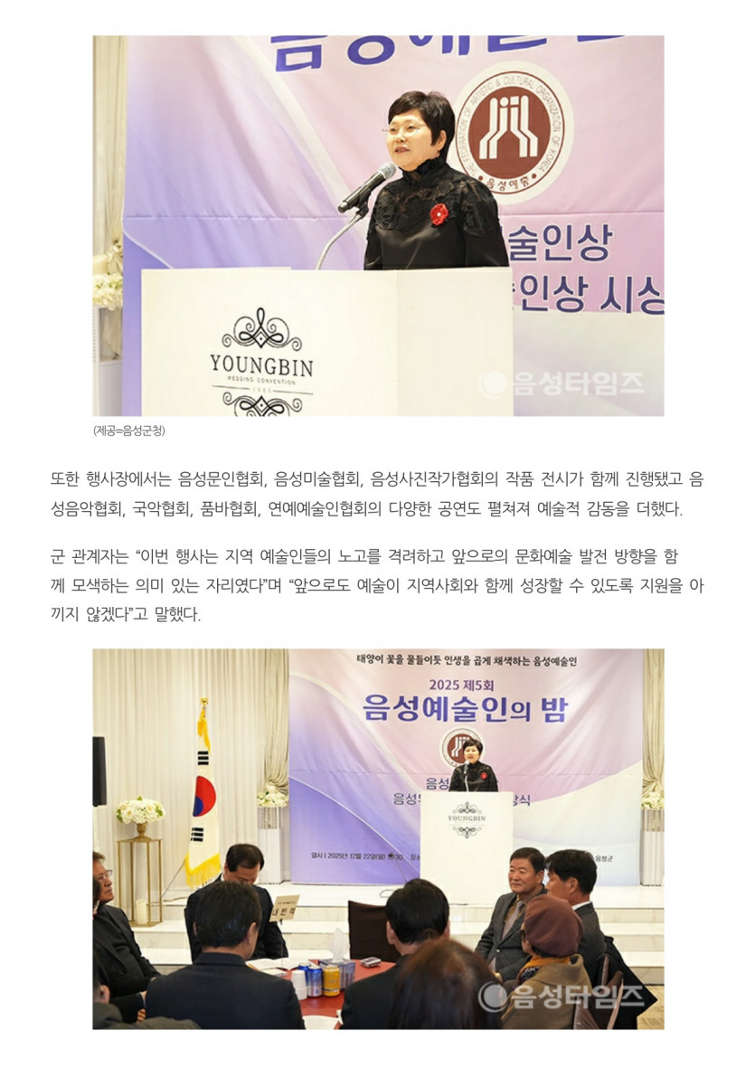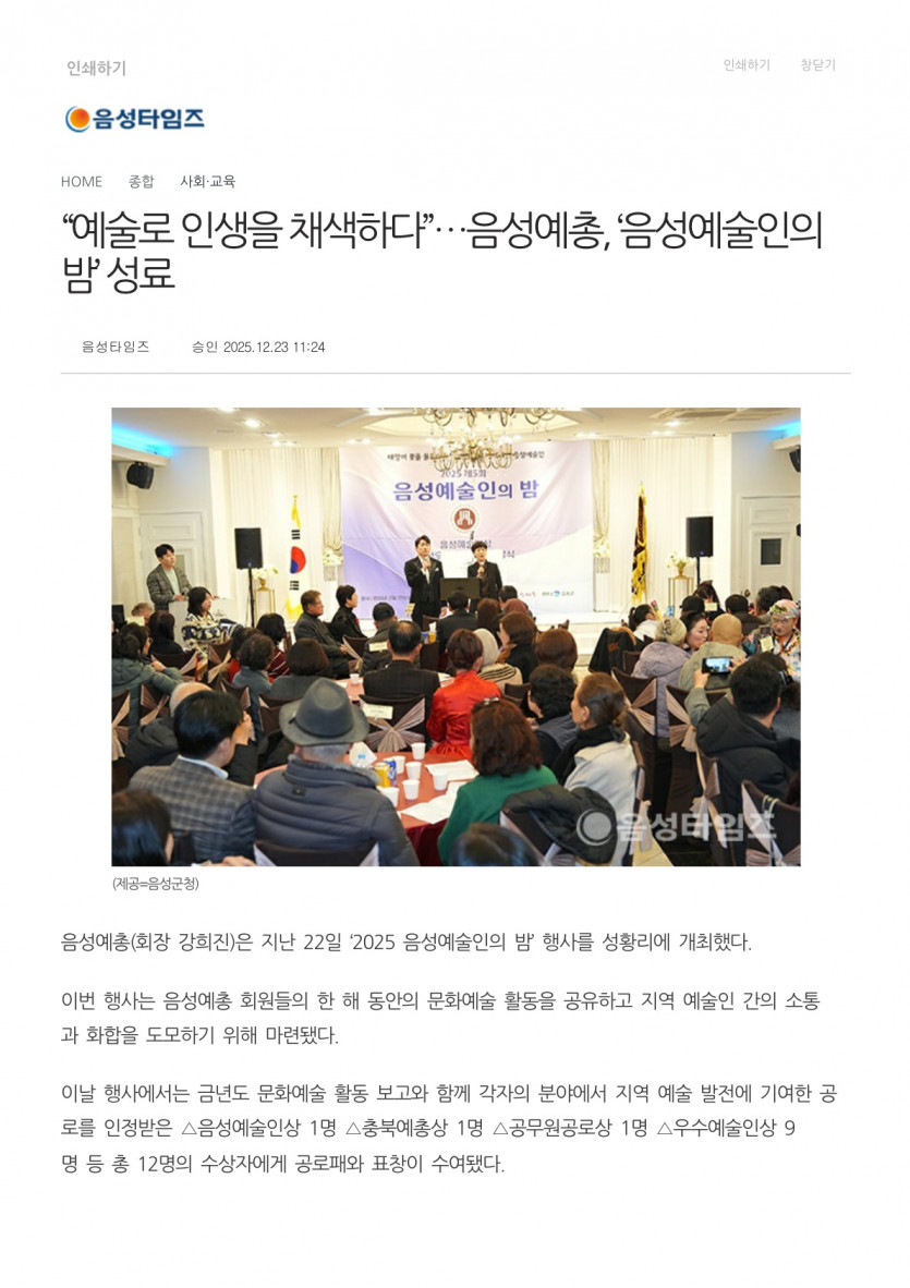 “예술로 인생을 채색하다”…음성예총, ‘음성예술인의 밤’ 성료(25.12.23 음성타임즈)